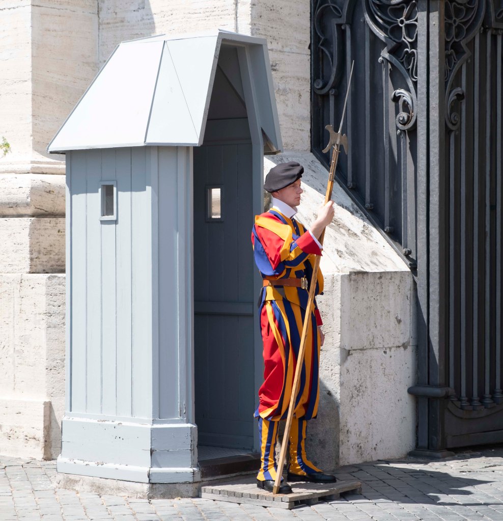 離開聖伯多祿大殿前,不能錯過的還有瑞士衛隊(Swiss Guard)。這些穿著橙藍兩色中世紀軍服的士兵,歷史可追溯至16世紀,當時聘請僱兵作戰是常有之事,而瑞士則是傭兵大國。教宗也不例外,聘用了一隊瑞士衛隊,這編制一直保留至今,教宗衛隊必須由瑞士男性擔任,而其職責除了保護教宗,也變成遊客拍照景點。