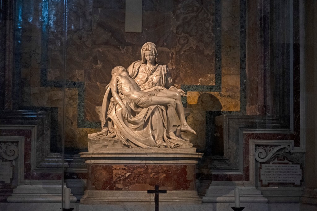 一如傳統教堂,大殿作十字架形,外觀除雕像較多外並不顯眼,內裡卻金壁輝煌,滿是價值連城的藝術品。遊客踏進大殿,必先向右邊看,那尊聖母抱著耶穌遺體的雕像,就是米高安哲羅的成名作《聖殤》,也是他唯一有署名的作品,過往曾被人破壞,現今已用上防彈玻璃保護。