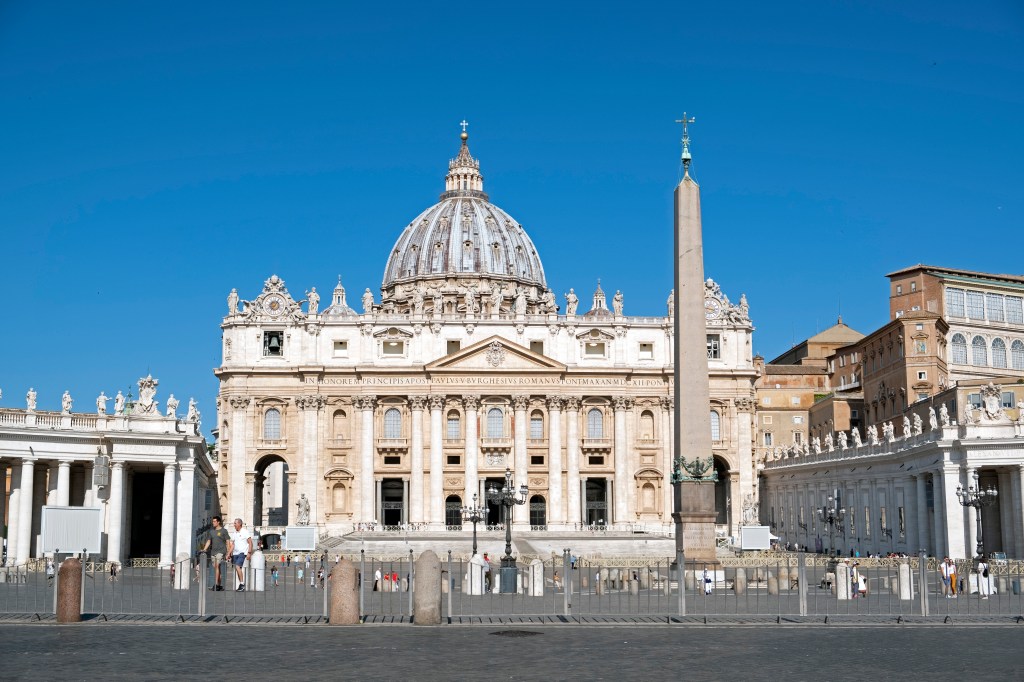 來到聖伯多祿大殿前,只見左右兩道迴廊像上帝張開手臂擁抱每一位信徒,廣場上有兩尊雕像,一為寫了一半新約聖經的聖保羅,另一則為聖彼得,正中央則是羅馬皇帝卡利古拉(Caligula)從埃及帶回來的方尖碑(Obelisk)。經過設於「手臂」內的安檢,就可以進入這座世界上最大的教堂。