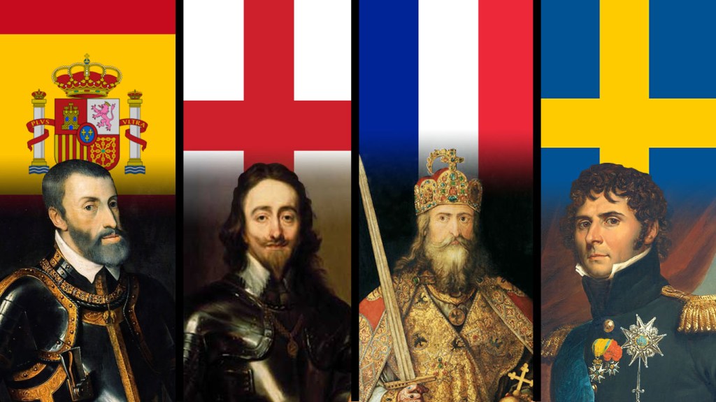 (左起)西班牙查理五世、英格蘭查理一世、法國查理大帝、瑞典卡爾十四世
