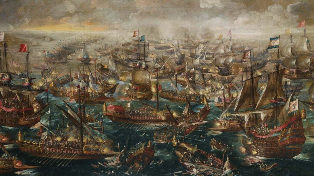 地中海常用的槳帆船需使用大量奴隸划槳(Andries van Eertvelt: The Battle of Lepanto of 1571, 1640)