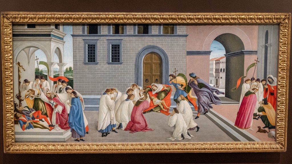 依照展覽名稱,自波提切利(Sandro Botticelli,1445-1510),說起。其人生平,早已在專題展覽中介紹,不再重複,這次參展的是《聖芝諾比烏斯的三個奇跡》(Three Miracles of Saint Zenobius,約1500)。聖芝諾比烏斯是佛羅倫斯的主教,傳說中他行過三個神跡,分別為畫作最左邊的為青年驅魔、中間讓溺死的幼兒復活、右邊讓盲人重見光明。