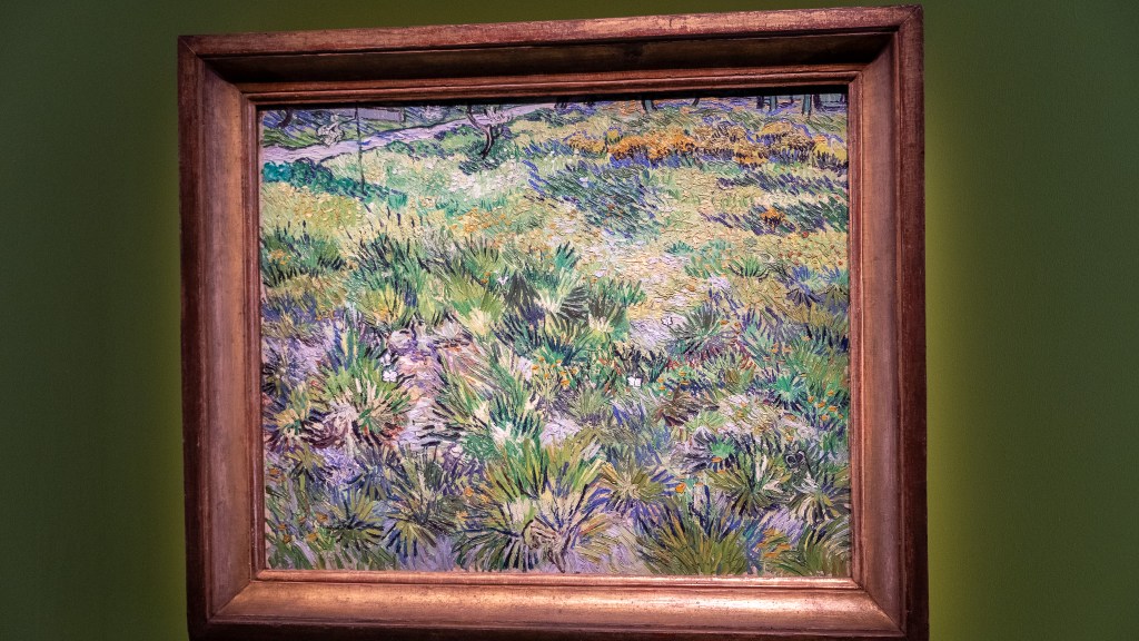 至於梵高的作品,則是《長草地與蝴蝶》(Long Grass with Butterflies,1890),無論是顏色還是筆觸,都比莫內的作品來得鮮明。這是因為梵高的作畫技巧,如林布蘭一樣使用厚塗法,一筆一筆把顏料塗抹在畫布之上,其顏料之濃稠,甚至令畫作像浮雕一樣突起。