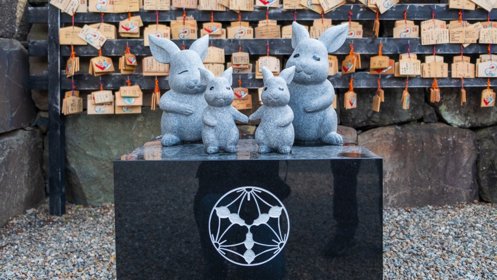 就在此時,大國主神路過,好心地幫兔子洗乾淨,敷上藥粉,令兔子非常感激,說美人一定會愛上大國主神,結果預言成功,美人只鍾情於大國主神一個,這就是「因幡白兔」的故事。出雲大社境內也因此有不少白兔雕像,甚至說大社最靈驗的就是祈求姻緣。