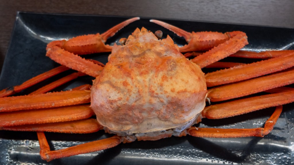這次旅行團安排每人一隻松葉蟹,本以為只是小小的一只,沒想到見到真身後,尺吋竟然比想像中大得多,實在是一個驚喜。要知道,松葉蟹最好吃的部位就是蟹腳,而蟹的體型愈大,腳也會愈粗壯,直接影響口感和味道,因此這次吃到的松葉蟹,味道實在是合格之上的水平。