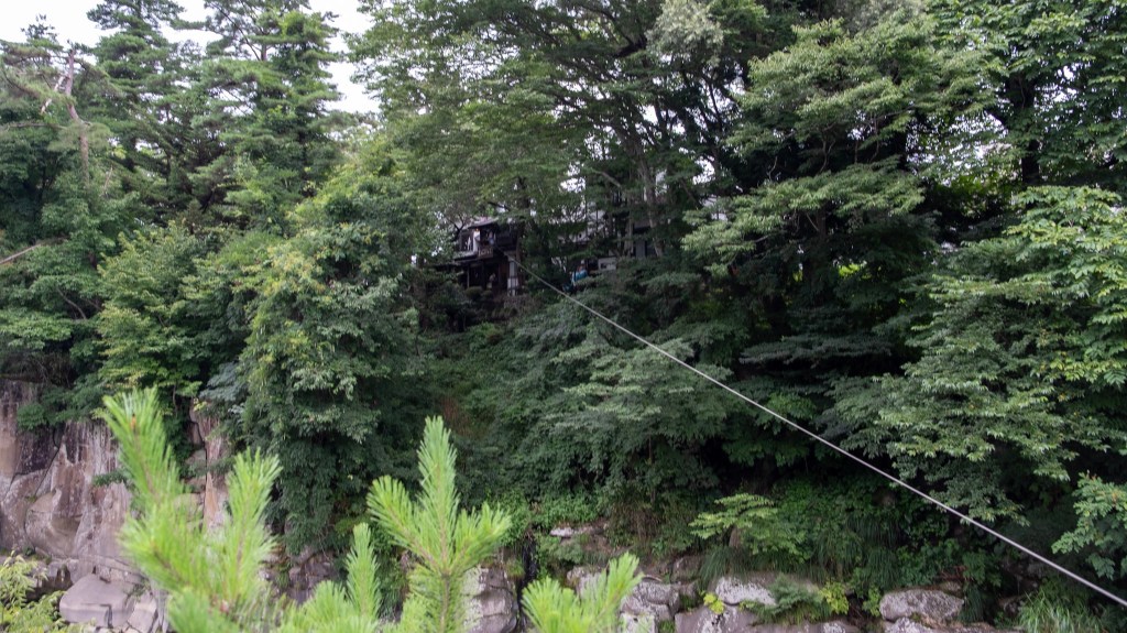 拍攝嚴美溪,可到中間橫跨河谷的橋上拍照,就是標準明信片的場景。走過了橋,到懸崖邊的涼亭旁,有一條麻繩,那不是讓人飛過河谷之用,而是對面的茶屋用來售賣糰子。