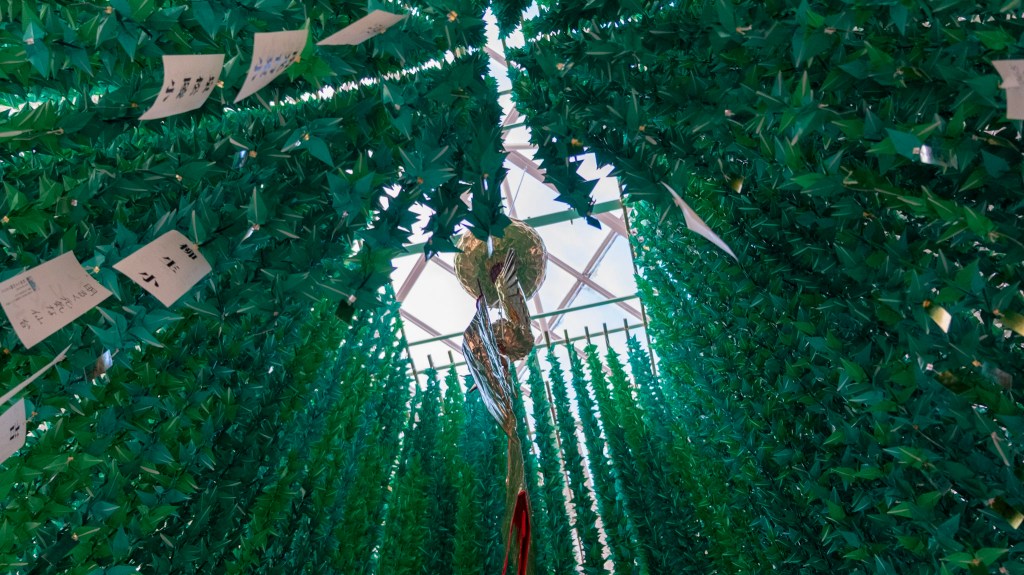 在商店街中間,還有一個四方形的掛飾,外面白色,中間吊著一串串綠色的紙鶴,下面則掛著紙片,寫上仙台不同學校的名稱。走到正下方往上拍,就可以得到一幅角度特別的照片,綠色紙鶴環繞四周,中間則是一道光,彷彿未來充滿光明。