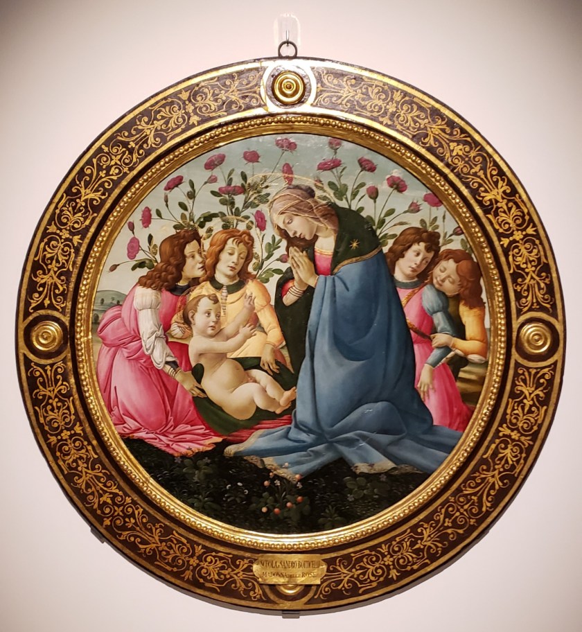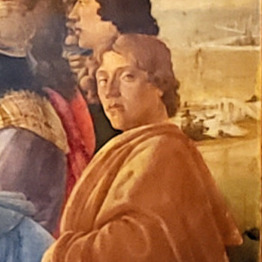 展覽中名氣最大的畫作是波提切利的《三博士來朝》,繪於1475至1476年,以東方三博士朝拜剛誕生的耶穌為題材,最特別的是把整個麥迪奇家族都畫進了作品,位於畫面正中央、碰到耶穌的老伯就是佛羅倫斯國父科西莫(Cosimo de’ Medici, 1389-1464),最左面的則是負責出資的贊助者羅倫佐。波提切利本人也親自上場,站於畫面最右邊,穿著黃色長袍,這也顯示了他與麥迪奇家族的關係非常友好,不然金主不可能讓畫家把自己畫進繪畫之中。